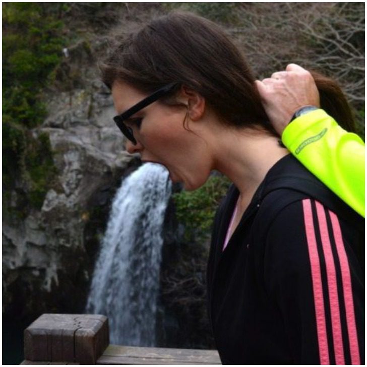 This one looks like nature caught someone at the worst possible moment. The timing makes it seem like the waterfall chose her as its exit point, and a helpful friend stepped in like a pro, pulling her hair back with grave concern.
