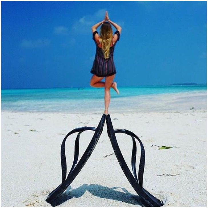 The detail that steals the show is what appears to be happening underfoot. Those sandals line up so neatly that it looks like she decided to level up and meditate on flip flops alone. It gives off a relaxed confidence, as if this were all part of the plan. Credit goes to timing, angles, and someone with patience behind the camera.