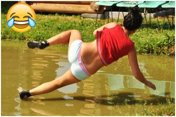 There is a special kind of confidence that comes right before everything goes wrong, and this frame catches it perfectly. The clothes still look fresh, the shoes haven’t met the mud yet, and there’s a split second where balance feels possible. One foot skims the surface, the other is already betraying her, and the water waits like it knows what comes next.
