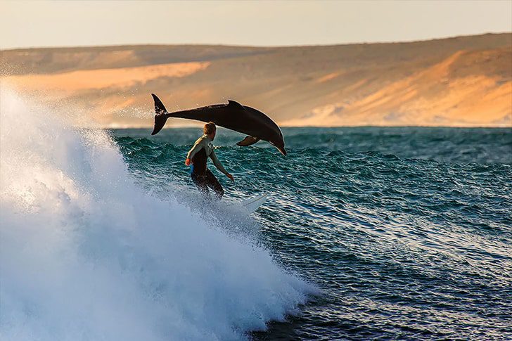 The dolphin doesn’t ease in or ask permission. It shows up mid-ride, confident, as if this wave was reserved earlier. The best part is the unspoken rivalry baked into the moment. The dolphin looks like it clocked the surfer and decided to make a point before dinner. No rush, no panic, just a smooth pass that says, “I was doing this long before boards existed.”
