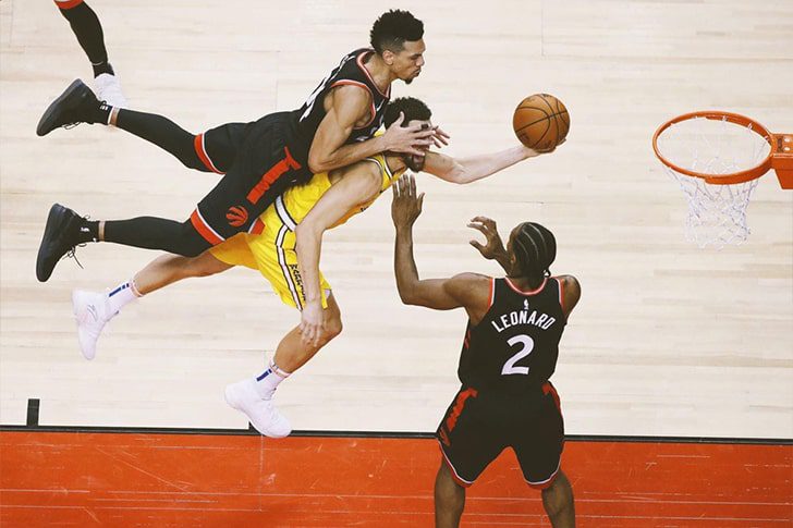 This photo is like a screenshot from a video game glitch rather than a championship game. Bodies are floating, arms are everywhere, and gravity is confused. This was Game 6 of the 2019 NBA Finals, with everything on the line and zero room for hesitation.