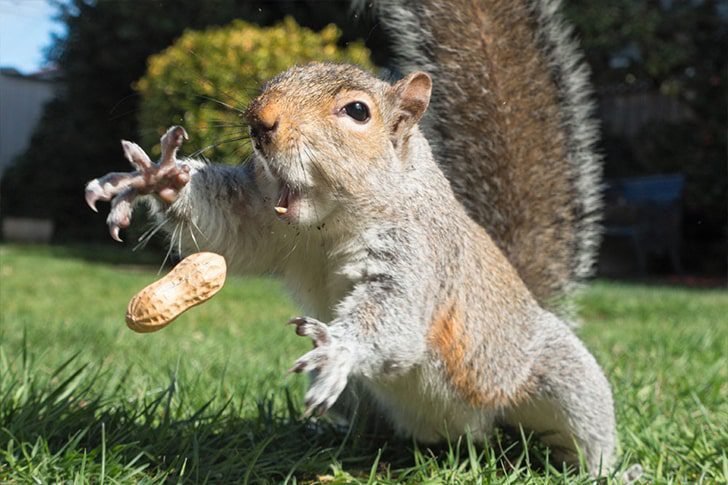 Some moments feel rehearsed, even when nature is improvising. This squirrel looks like it just unlocked a new skill, paws stretched out, eyes locked, and mouth ready for backup. The peanut floats in the air, as if it paused out of respect. There’s confidence here, the kind that says this isn’t the first flying snack handled today.